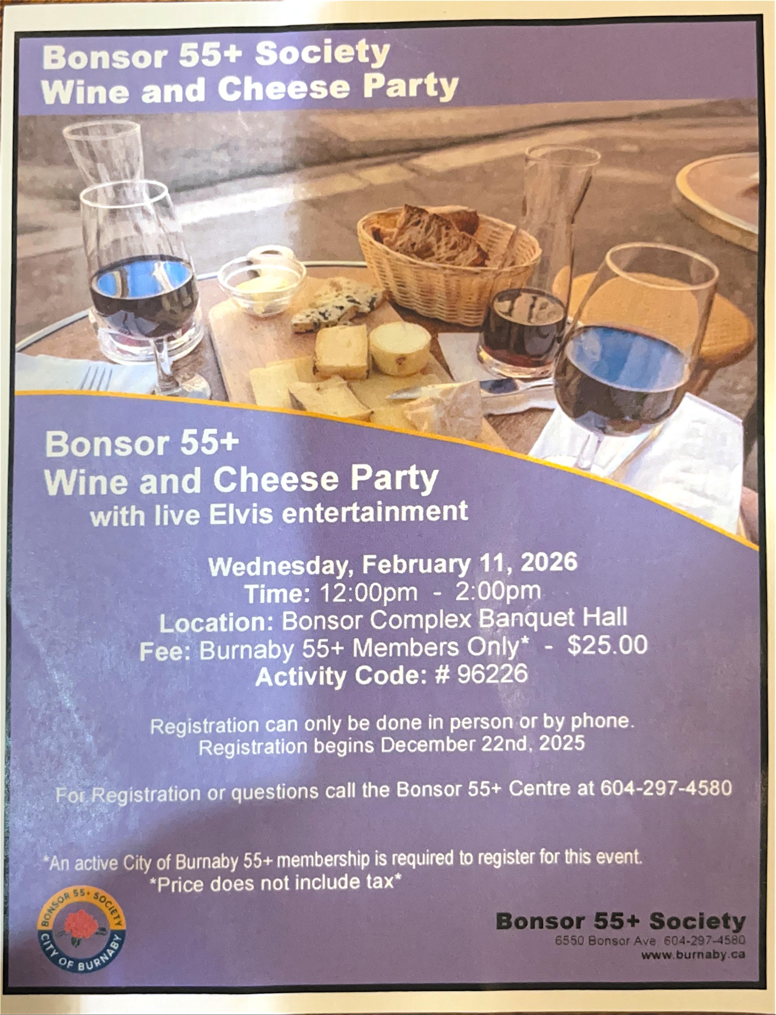 . Bonsor 55+ Society Wine and Cheese Party 2026